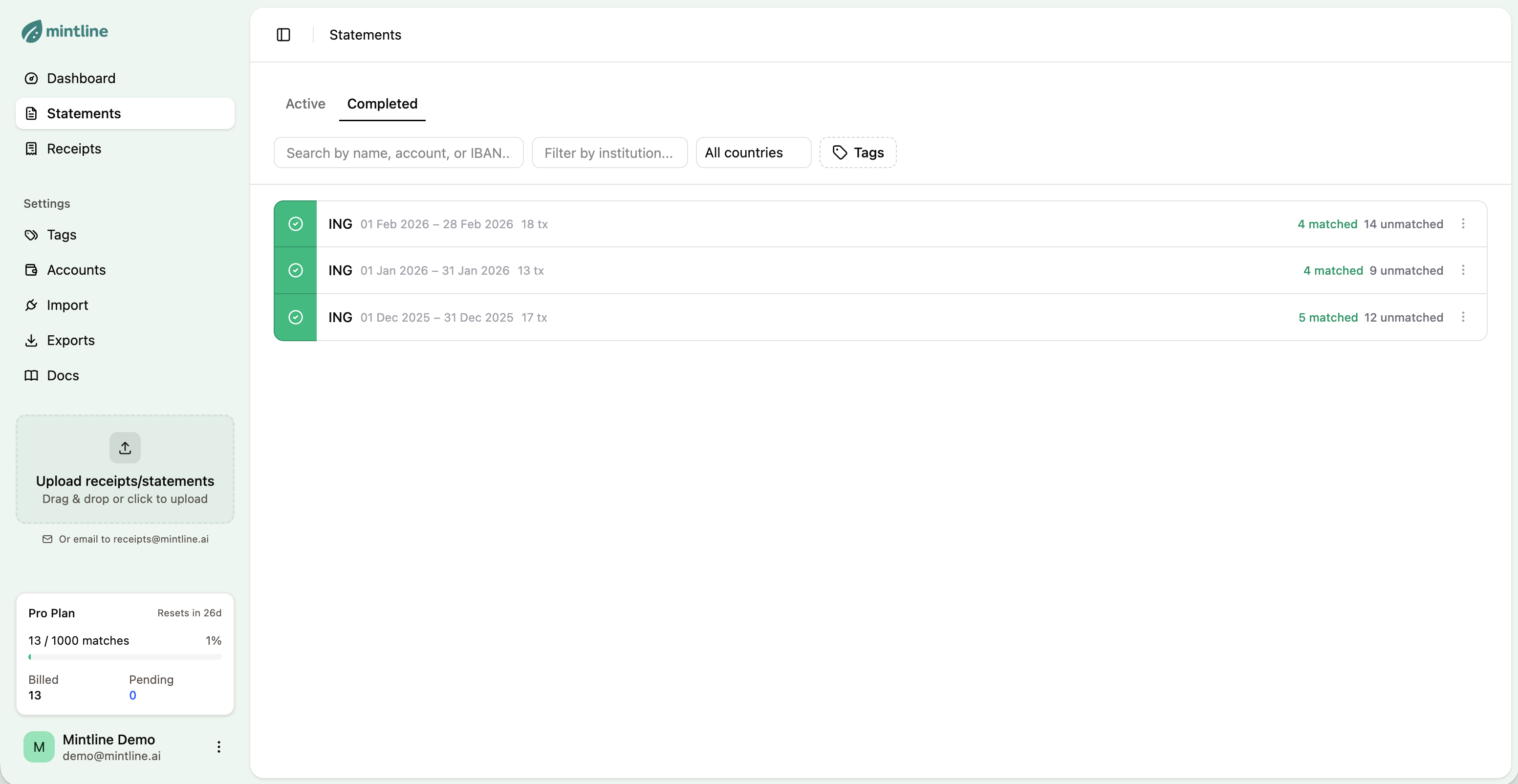 Once statements are uploaded, add receipts so Mintline can match them.